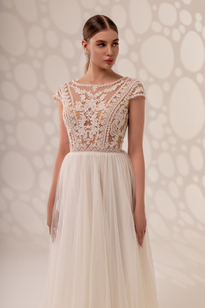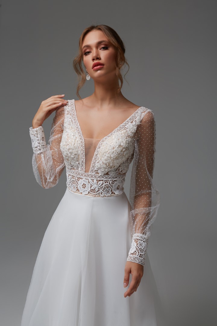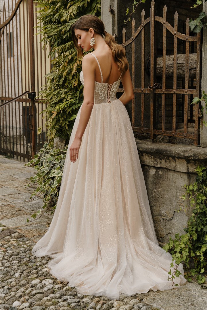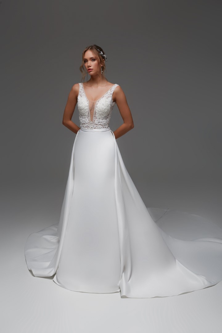 Az A-vonalú menyasszonyi ruha klasszikus és sokoldalú választás, amely minden testalkathoz illik. Az A-vonalú sziluett a deréktól lefelé fokozatosan bővül, ami elegáns és kecses megjelenést kölcsönöz.