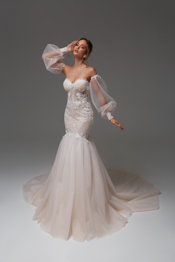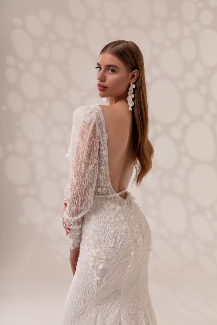 A sellő fazonú menyasszonyi ruha szorosan követi a test vonalát, és térdnél bővül. Ez a stílus kiemeli a nőies vonalakat és drámai megjelenést biztosít.